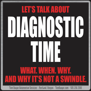 It would be unfair either to expect a blank check for diagnostic time or to charge you for time we don’t use.  (Portland auto repair icon Harold Dick prospered for 40 years under a different model; he’d fix your car, you’d pay whatever he said, and if you didn’t like it he’d never touch your car again.)  If we see the need for diagnostic time WE’LL TELL YOU HOW MUCH WE EXPECT CLEARLY AND IN ADVANCE, and if we need to go further we will CALL YOU FIRST.  If we didn’t use all the time you authorized we’ll adjust your bill appropriately.  Yes, we need to be paid, but no, we don’t need or want to be abusive about it.