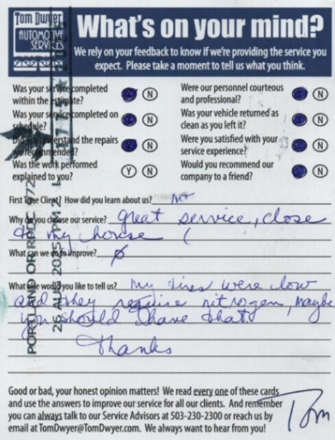 I’m writing about your recent Post-Service Reply card. Thank you for responding, because these cards are critically important to us and we read every one! You mentioned that your tires require nitrogen, and suggested we look into providing nitrogen as a shop. I don’t think we can be very encouraging to you on this, but maybe we can be helpful.